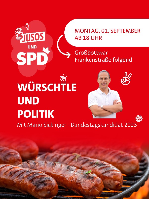 Habt Ihr Lust über politische Themen, Gemeinde-, Landes- und Bundespolitik zu sprechen und dabei frische Würstchen zu genießen? Dann kommt gerne zu unserem Grillfest der SPD und Jusos Bottwartal!